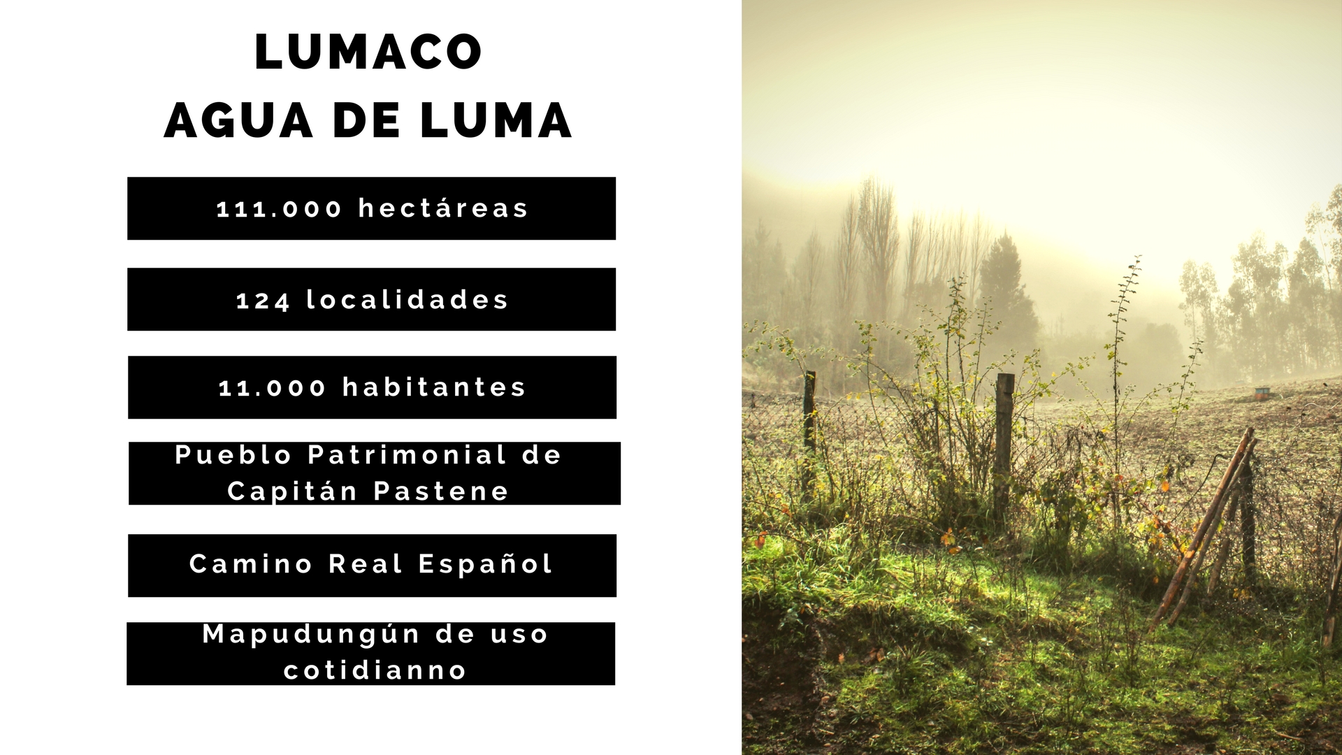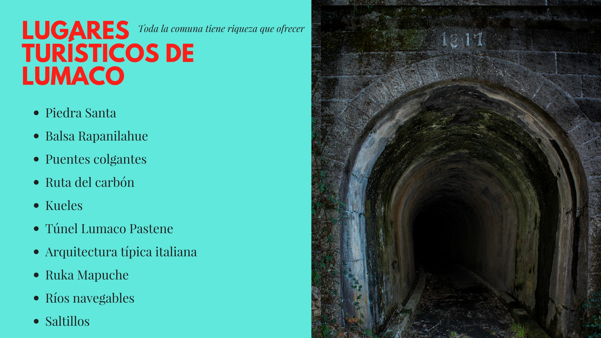 La Oficina Municipal de Turismo Lumaco, tiene por objetivos Valorar y Posicionar la riqueza cultural de Lumaco; y mejorar la vinculación de productos/servicios locales con visitantes turísticos.
